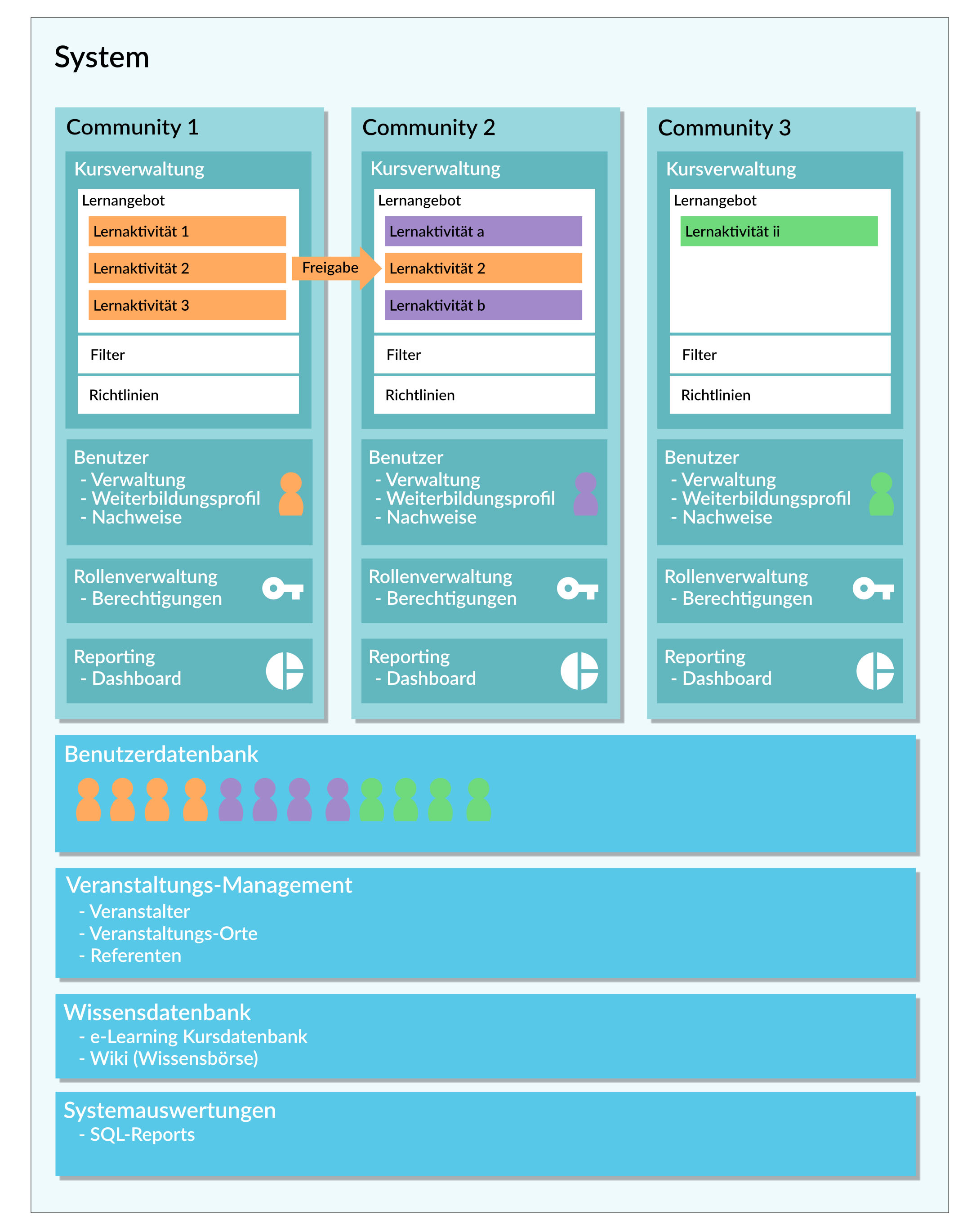 easylearn ist flexibel und geht auf die Bedürfnisse seiner Kundschaft ein. Statt also auf das zuvor beschriebene System mit starren Community-Zuordnungen zu setzen, hat easylearn gemeinsam mit fenaco ein massgeschneidertes Berechtigungskonzept entwickelt. So bildet die Genossenschaft jetzt alle Tochtergesellschaften in einer einzigen Community ab, mit zentraler Steuerung und klar geregelten Zugriffsrechten: