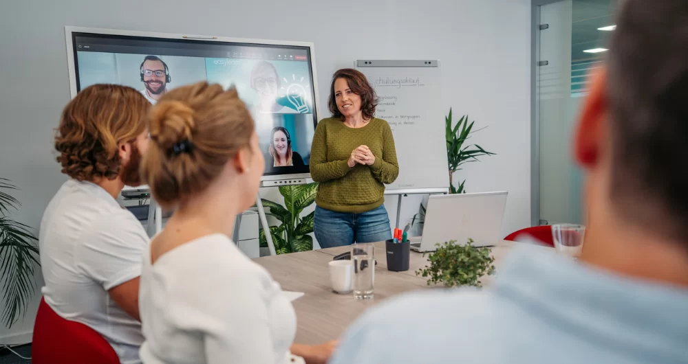 Während die Vor-Ort-Gruppe direkt interagiert, sind Online-Teilnehmende auf digitale Kanäle angewiesen. Gute Schulungskonzepte sorgen dafür, dass diese Distanz nicht spürbar wird, indem die gewählten Tools für beide Gruppen gleich gut funktionieren. Chatnachrichten, Wortmeldungen und Reaktionen der Remote-Gruppe sind jederzeit sichtbar und klar zuordenbar.